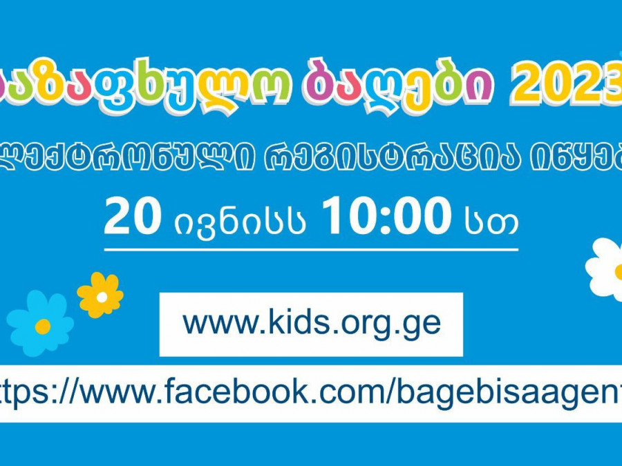 საზაფხულო ბაღებში რეგისტრაცია, რომელიც ელექტრონულად, თბილისის საბავშვო ბაგა-ბაღების მართვის სააგენტოს ვებგვერდზე - www.kids.org.ge წარიმართება, 20 ივნისს, 10:00 საათზე დაიწყება. აღნიშნული მომსახურებით ისარგებლებენ თბილისის საბავშვო ბაგა-ბაღების აღსაზრდელები.